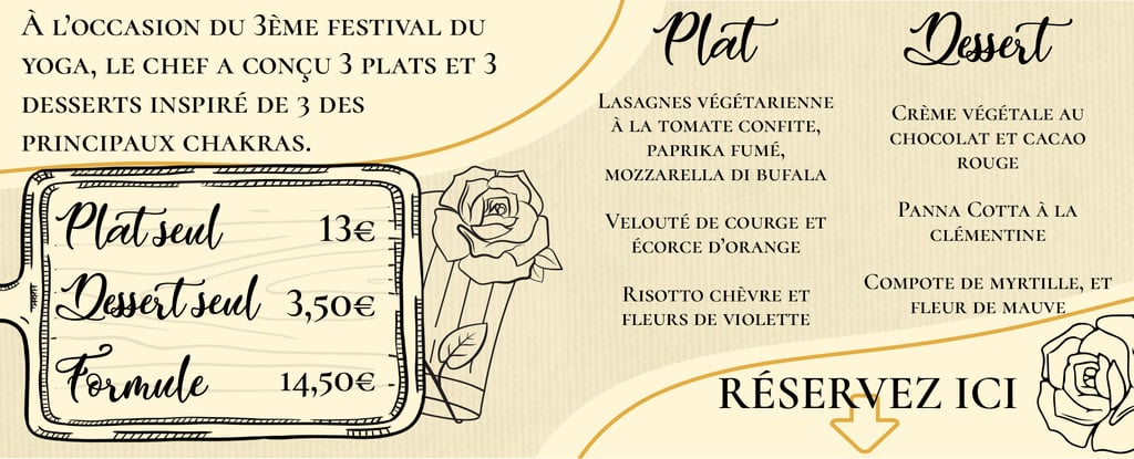 Pour réserver et régler merci de cliquer sur le bouton de réservation. Ajustez la quantité, renseignez votre choix et votre jours de récupération. Le règlement d'un plat tien lieux de réservation.